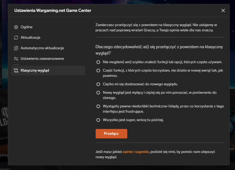 Dobra wiadomość jest taka, że nie trzeba reinstalować gier. Wszystkie dotychczasowe instalacje pozostają na swoim miejscu, a ustawienia i postępy gracza są zachowane. Przejście na nowy interfejs odbywa się z poziomu samego launchera — wystarczy użyć odpowiedniej opcji w WGC.