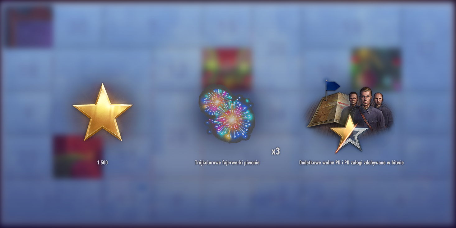 • 1500 punktów wolnego doświadczenia • 3 naklejki „Trójkolorowe fajerwerki piwonii” • 1 rezerwa: 200% do doświadczenia za bitwę na 1 godz.