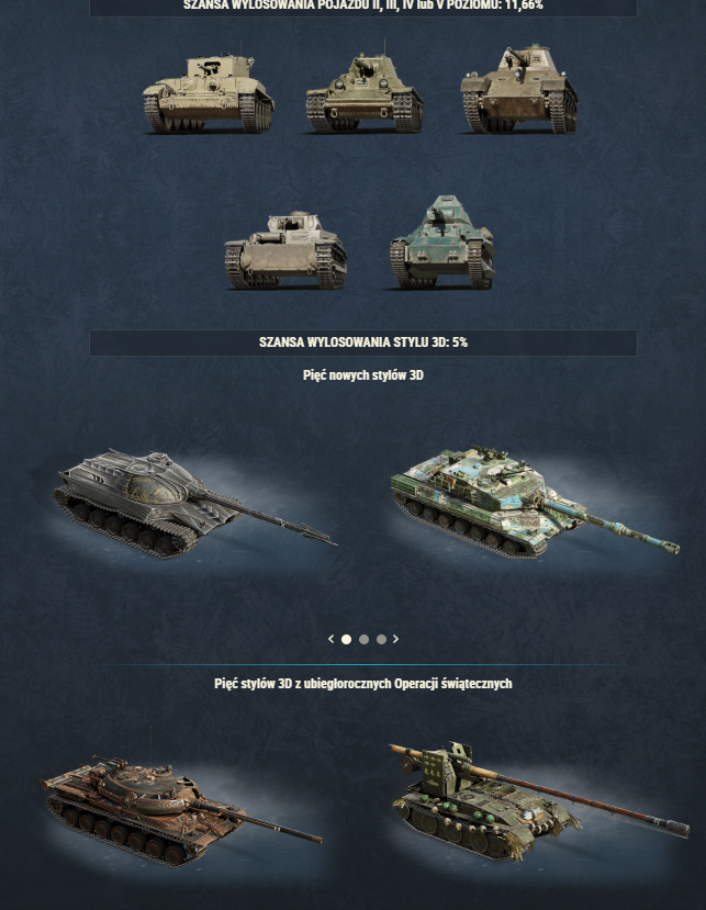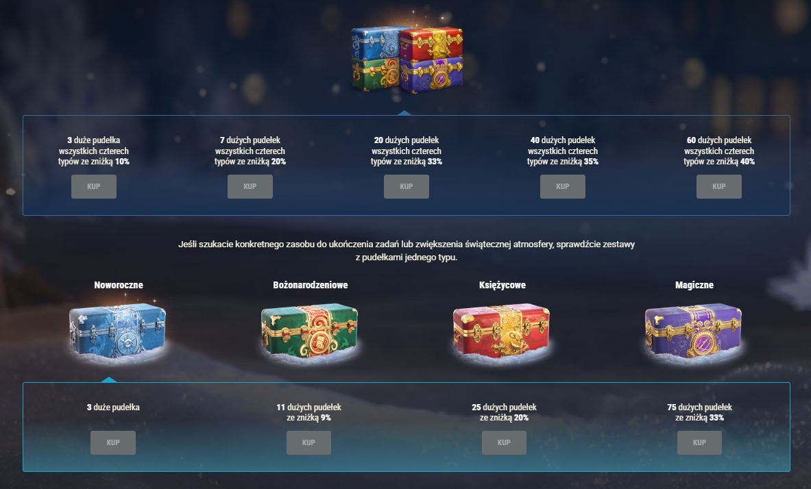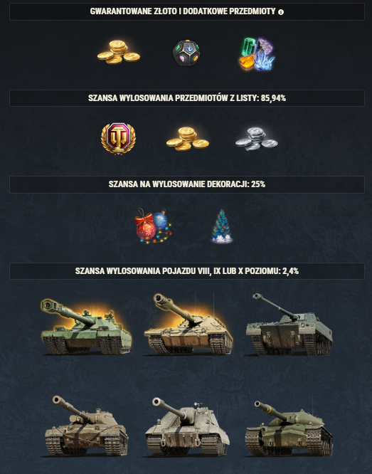Sprawcie sobie i znajomym duże pudełka, które są nieodłącznym elementem tego uwielbianego wydarzenia. Gwarantowane są 250 szt. złota w każdym pudełku i zasoby Operacji świątecznych, a do tego wyjątkowy nastrój. Dodatkowe możliwe prezenty to sześć pojazdów poziomów VIII–X, 10 stylów 3D, 15 dodatków 3D oraz więcej złota.