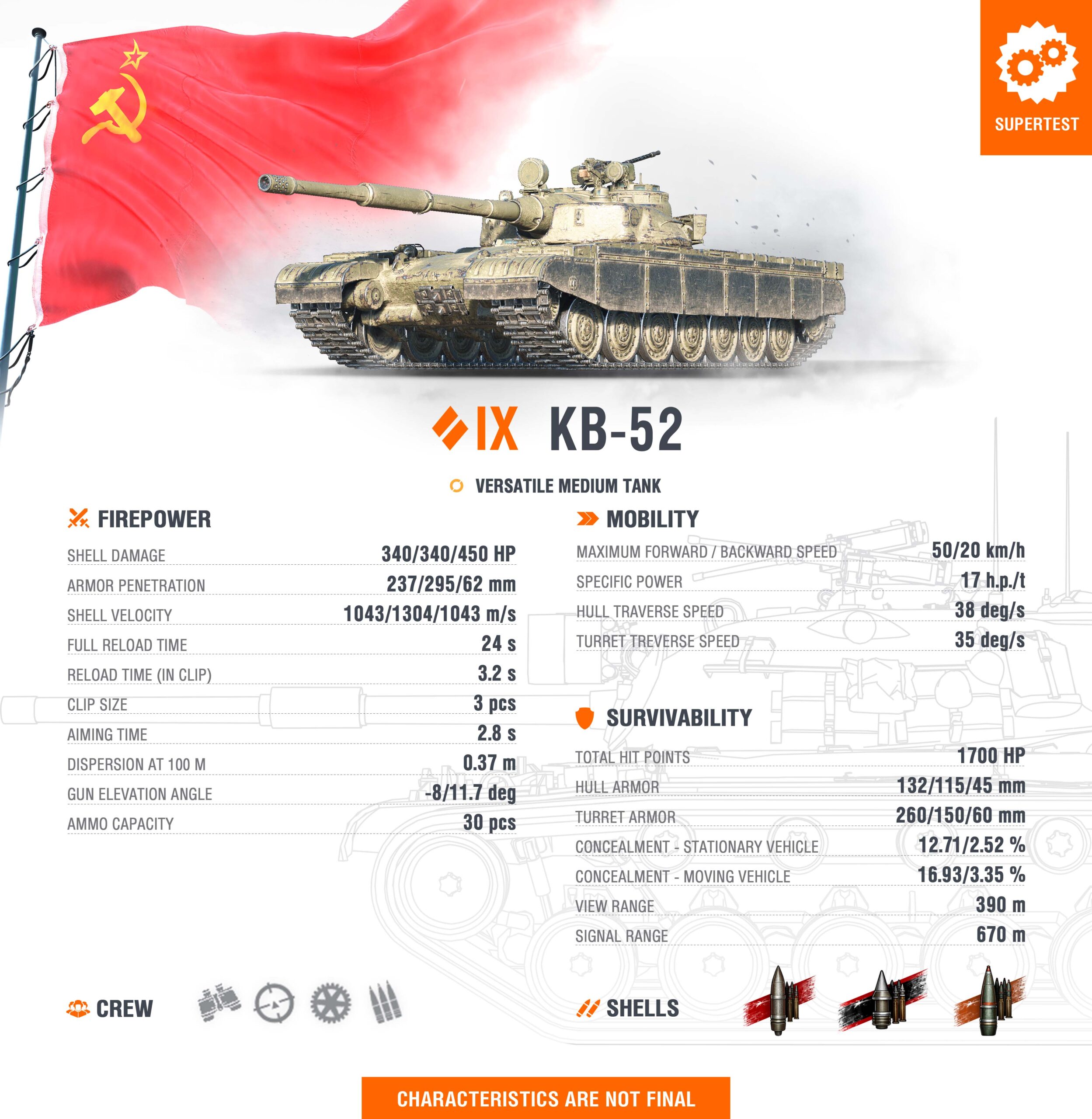 KB-52 to radziecki uniwersalny czołg średni IX poziomu łączący najlepsze cechy pojazdów średnich i ciężkich – dobrą żywotność (1700 PW), automat ładujący na 3 pociski i pewne działo zadające 340 PW uszkodzeń na strzał.