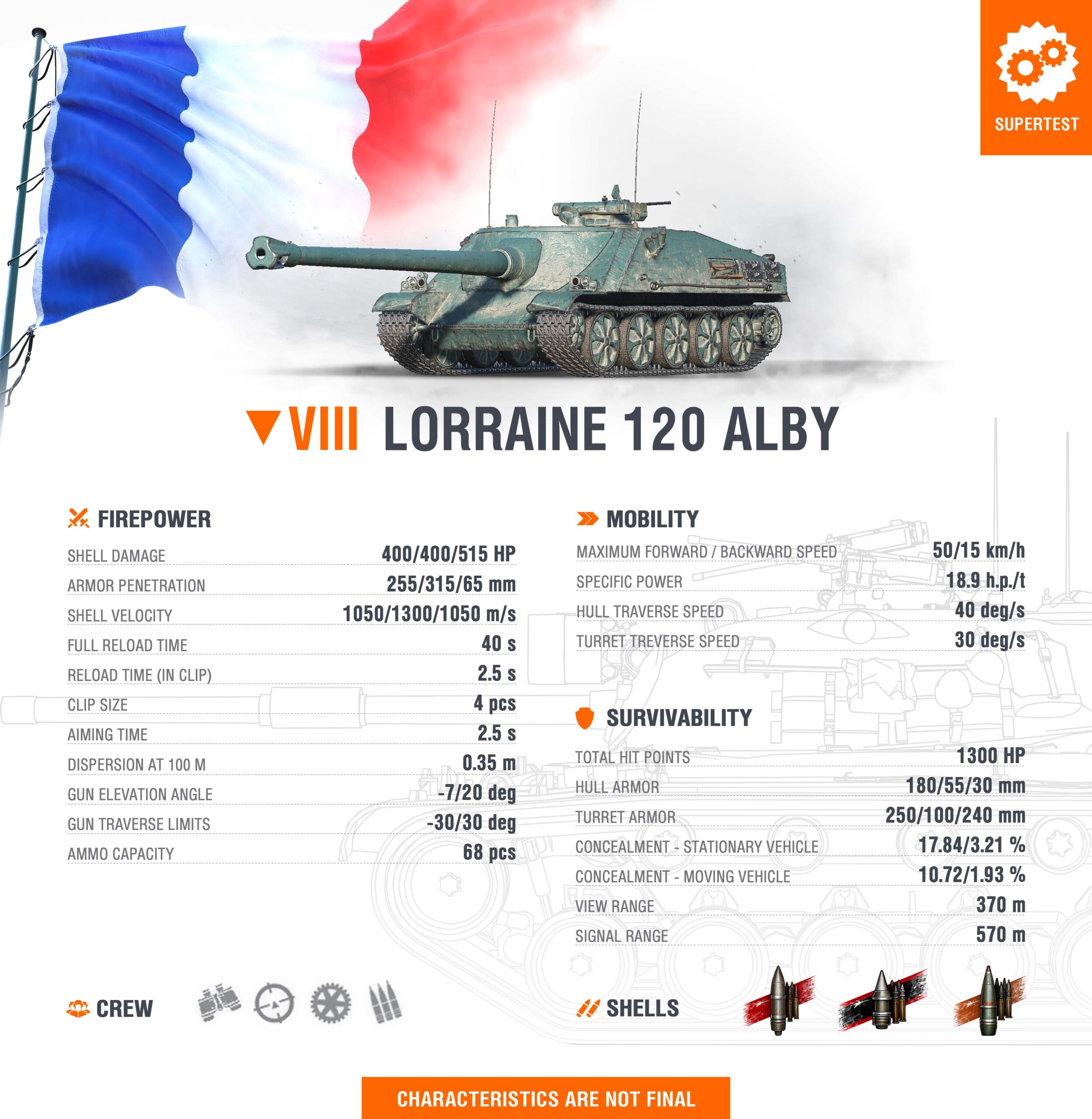 Lorraine 120 Alby to francuski niszczyciel czołgów VIII poziomu zaprojektowany zgodnie z najlepszymi tradycjami francuskich niszczycieli czołgów do zbadania – ma niski profil, świetną mobilność (prędkość maksymalna – 50 km/h, jazda wstecz – 15 km/h), a także dobrze nachyloną przednią płytę i ledwie kilka oczywistych słabych punktów.