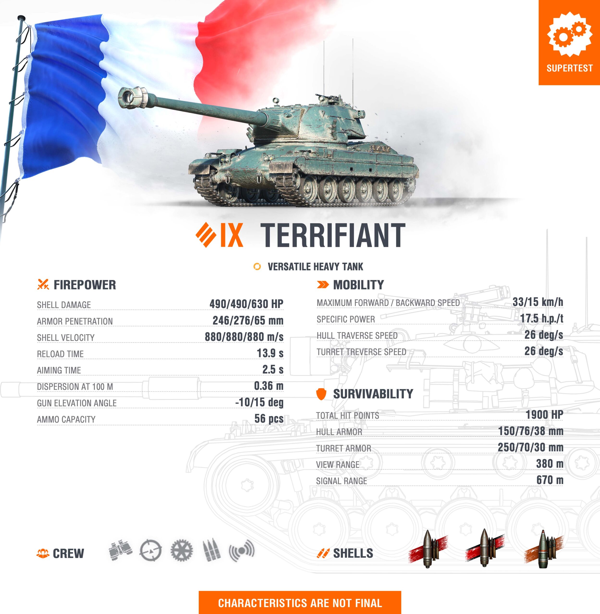 Terrifiant to francuski czołg ciężki IX poziomu. Jest podobny do pojazdów z tzw. „alternatywnej” francuskiej gałęzi czołgów ciężkich, z mocnym przednim pancerzem wieży i kadłuba (wartości nominalne to, odpowiednio, 150 mm i 250 mm) i sprawnym działem zadającym 490 PW uszkodzeń na strzał z niezłą celnością (0,36).